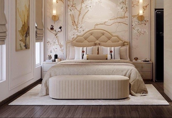Phần trên cùng của đầu giường được tạo dáng bởi các đường cong tạo nên một tuyệt tác trong phòng ngủ. Các nút đồng được đóng viền bao quanh đầu giường tạo điểm nhấn sang trọng cho giường. Màu vải của giường cũng cùng tone, rất phù hợp với màu tranh trên tường và thảm lót sàn, tạo nên khung cảnh phòng ngủ một ánh sáng lung linh, huyền ảo.